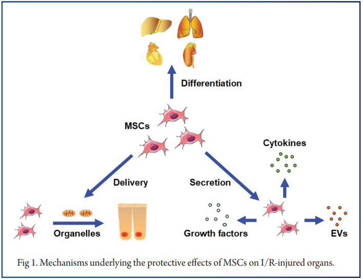 Lastly, MSCs exhibit the ability to directly deliver organelles to injured cells, thereby contributing to survival and proliferation.Based on multiple actions, MSCs can alleviate the I/R injury on target tissues. First, MSCs can differentiate into related functional cells, thus favoring regeneration. Second, via secretion of various cytokines, growth factors and EVs (Extracellular vesicles), MSCs can generate a better post-injury microenvironment.