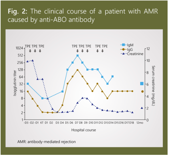 The clinical course that unfolded for the sole case of AMR (due to anti-ABO antibody) has been depicted in Figure 2.