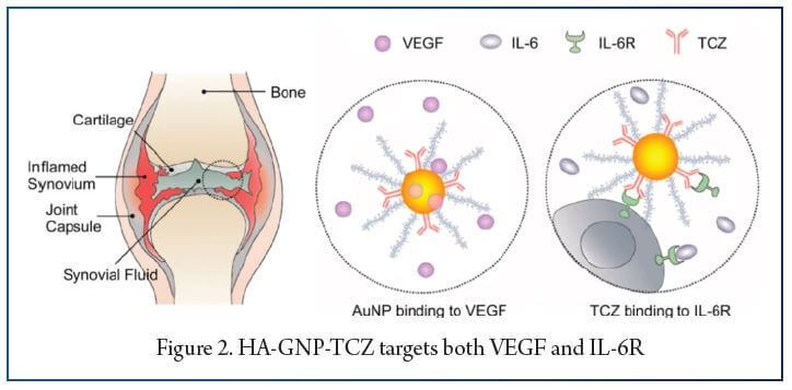 Gold nanoparticles (GNPs) are gaining popularity in drug delivery due to their stability, effectiveness, biocompatibility, and modifiable optical properties. They can be prepared in various sizes and shapes, exhibit good targeting performance, and have a high drug loading capability. GNPs can preferentially absorb X-rays to enhance the effect of radiation therapy and can also be used as nanoprobes and contrast agents for diagnosing rheumatoid arthritis (RA). Studies have shown that GNPs have anti-angiogenic effects, reduce inflammation levels, and inhibit bone erosion or cartilage destruction in RA. Researchers have designed a new drug delivery system, HA-GNP-TCZ, which can target both IL-6 and VEGF and significantly reduce the level of inflammatory cell infiltration, cartilage destruction, and bone erosion in RA. GNPs accumulate in different organs but do not cause any toxicity or cell damage and can effectively delay the progression of RA. The application of GNPs in the biomedical field holds great potential, and targeted treatment of TCZ delivered by GNPs has shown promising results in alleviating the narrowing of the joint space, bone erosion, and inflammation in RA patients.