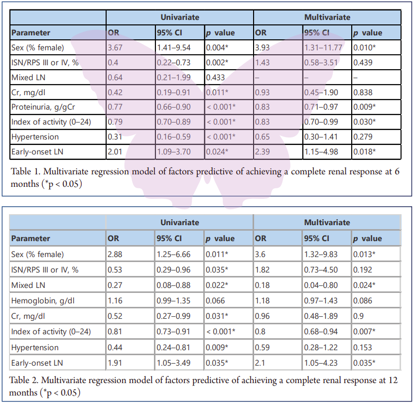 The predictors of a CR at 6 and 12 months after induction therapy in the univariate and multivariate analyses are shown in Tables 1 and 2, respectively. In the multivariate regression analysis, the independent predictors of a CR at 6 months after induction therapy were female sex (odds ratio [OR] 3.93, 95% condence interval [CI] 1.31–11.77, p=0.010), proteinuria (g/gCr) (OR 0.83, 95% CI 0.71–0.97, p = 0.009), index of activity (0–24) (OR 0.83, 95% CI 0.70–0.99, p=0.030), and early-onset LN (OR 2.39, 95% CI 1.15–4.98, p = 0.018). The independent predictors of a CR at 12 months after induction therapy were female sex (OR 3.60, 95% CI 1.32–9.83, p=0.013), mixed LN (OR 0.18, 95% CI 0.04–0.80, p=0.024), index of activity (0–24) (OR 0.80, 95% CI 0.68–0.94, p = 0.007), and early-onset LN (OR 2.10, 95% CI 1.05–4.23, p = 0.035).