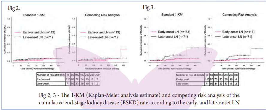 Seven patients (3.8%) progressed to ESKD, and nine patients (4.9%) died during the observation period. The 1-KM (Kaplan-Meier analysis estimate) and competing risk analysis showed that the cumulative incidence of ESKD was not significantly different between the early-onset LN group and late-onset LN group (p= 0.725 and p = 0.575, respectively) (Fig. 2), whereas the cumulative incidence of mortality difiered significantly between the early- and late-onset LN groups (p = 0.031 and p = 0.040, respectively) (Fig. 3).