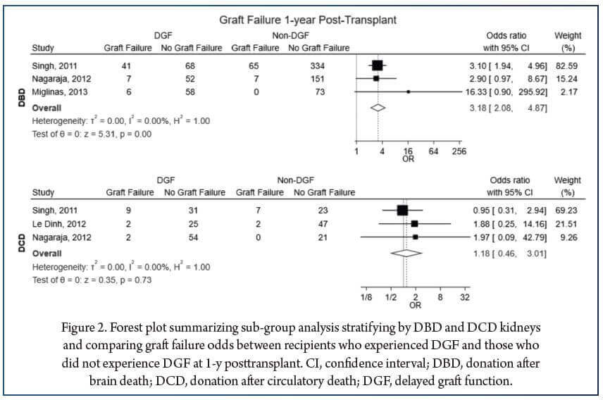 This study analyzed 38 studies on graft failure outcomes in patients who experienced delayed graft function (DGF) after transplantation. 29 studies compared DGF patients to non-DGF patients, with 23 being single-center studies and 6 registry-based. Patients who experienced DGF had significantly higher odds of graft failure compared to those who did not experience DGF at 1-, 3-, and 5-years post-transplant in both single-center and registry-based studies. The odds of graft failure were higher in DBD kidney transplants but not in DCD transplants (Figure 2).