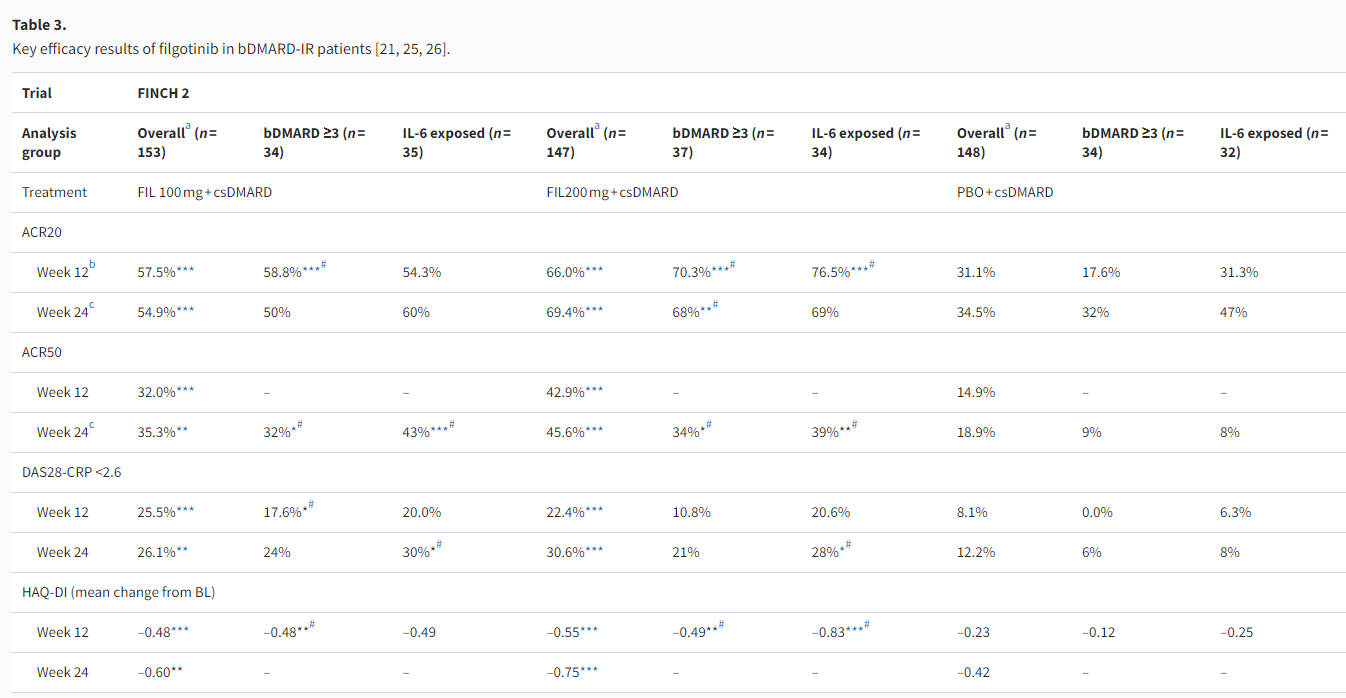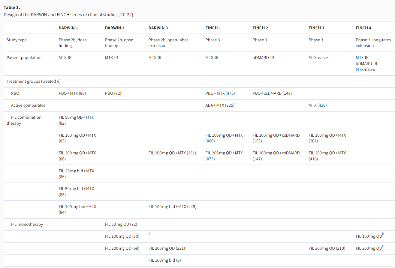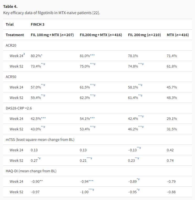 22. Westhovens R, Rigby WFC, van der Heijde D, Ching DWT, Stohl W, Kay J, et al. Filgotinib in combination with methotrexate or as monotherapy versus methotrexate monotherapy in patients with active rheumatoid arthritis and limited or no prior exposure to methotrexate: the phase 3, randomised controlled FINCH 3 trial. Ann Rheum Dis 2021. DOI:10.1136/annrheumdis-2020-219213.