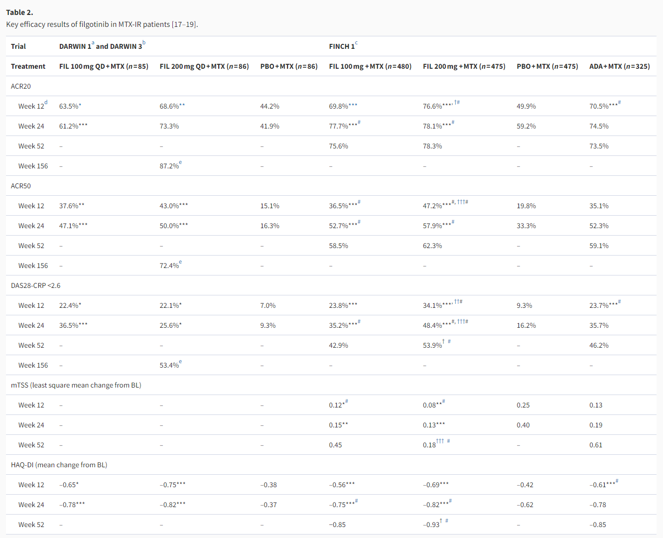 The DARWIN 1, DARWIN 3, and FINCH 1 studies evaluated the use of filgotinib in combination with MTX in patients with IRs to MTX as per the second-line therapy recommended in the EULAR treatment algorithm. The key efficacy data are summarized in Table 2.
