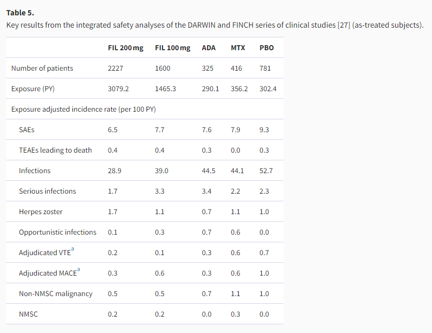 ADA: adalimumab; FIL: filgotinib; MACE: major adverse cardiovascular events; MTX: methotrexate; NMSC: non-melanoma skin cancer; PBO: placebo; PY: patient-year; SAE: serious adverse event; TEAE: treatment-emergent adverse event; VTE: venous thromboembolism.