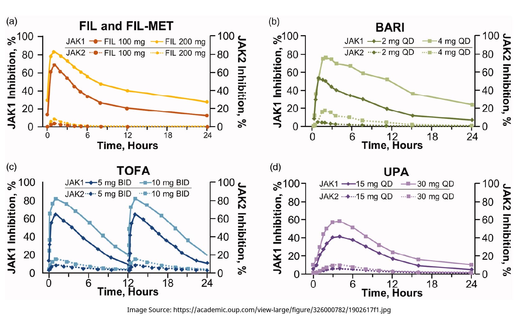 Modeled 24-h pharmacodynamic coverage of JAK1 and JAK2 inhibition by jakinibs at clinical doses [15]. BARI: baricitinib; BID: twice a day; FIL: filgotinib; FIL-MET: active metabolite of filgotinib; JAK: Janus kinase; QD: once a day; TOFA: tofacitinib; UPA: upadacitinib.