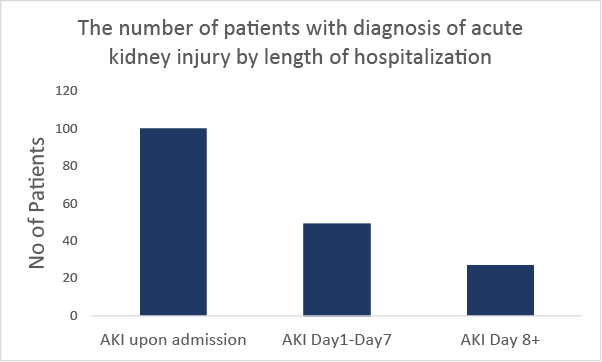 Of 777 patients eligible for the study, acute kidney injury developed in 176 (22.6%). Of these, 79 (45%) showed an acute worsening of a pre existing CKD, and 21 (12%) required kidney replacement therapy. Independent associates of AKI were chronic kidney disease, C-reactive protein (CRP) and ventilation support.