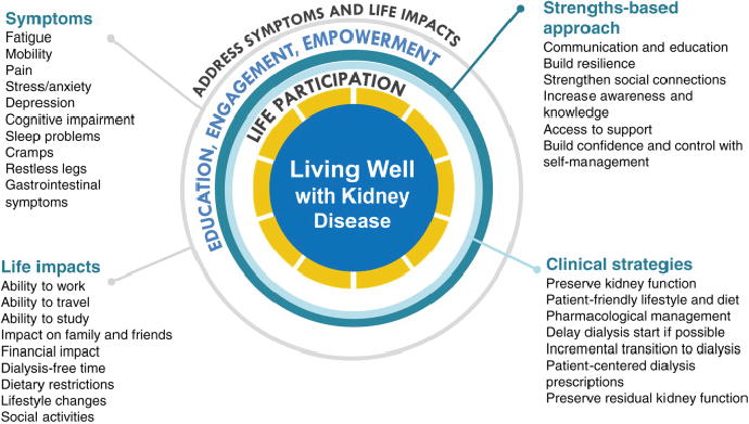 Chronic kidney disease (CKD), its associated symptoms and its treatment, including medications, dietary and fluid restrictions, and kidney replacement therapy, can disrupt and constrain daily living and impair the overall quality of life of patients and their family members.