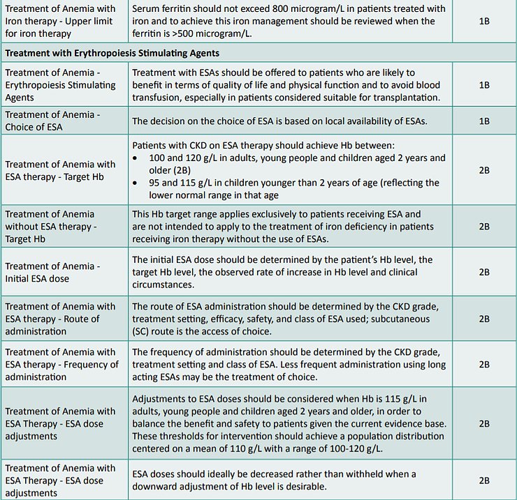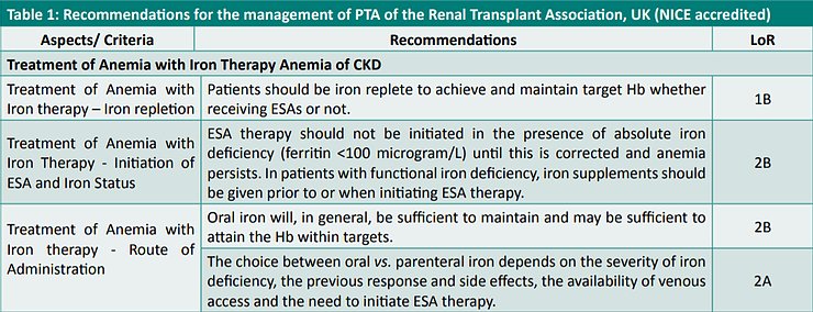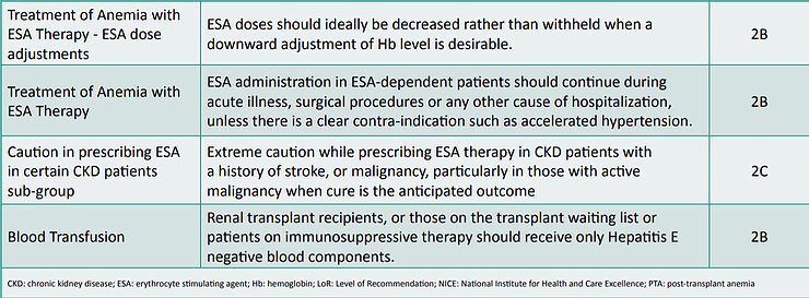 The Clinical Practice Guidelines on Anemia of Chronic Kidney Disease – 2017 promulgated by the Renal Association, UK and accredited by the National Institute for Health and Care Excellence (NICE), UK recommend that the treatment guidelines for anemia in renal transplant patients should be similar to those for CKD patients not on dialysis.