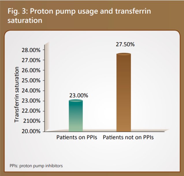The use of proton pump inhibitors has been linked to poor iron absorption contributing to iron-deficiency. It has also been observed that patients on proton-pump inhibitors had a lower transferrin saturation, (9) as depicted in Figure 3. A strong association of iron depletion has been established in renal transplant recipients taking high doses of proton pump inhibitors (PPIs) (OR=1.57). Therefore, limiting the use of PPIs in renal transplant patients serves beneficial. (10)