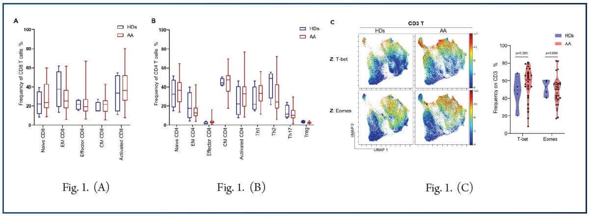 Immune checkpoint molecules play a critical role in the immune response of AA patients, with higher frequency of CTLA-4+ CD8+ T cells being found in AA (22.63 ± 2.11%, p < 0.05). However, no significant difference was observed between healthy controls and AA patients. Responders displayed a lower frequency of CD8+ at diagnosis, compared to non-responders (16.55% vs. 17.59% p =0.105). No statistically significant difference on PD-1+, LAG-3+, TIM3+, or TIGHT+ T cells was observed between the AA cohort and healthy volunteers.