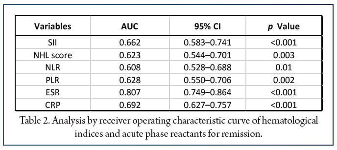In addition, the evaluation of efficacy for remission was performed using ROC curves. The AUC obtained from all hematological indices ranged from 0.608 to 0.628, indicating that these hematological indices were too weak to determine clinical remission, although they were statistically significant (Table 2). However, ESR showed significant accuracy for remission but not CRP (AUC = 0.807 for ESR and AUC = 0.692 for CRP, respectively).