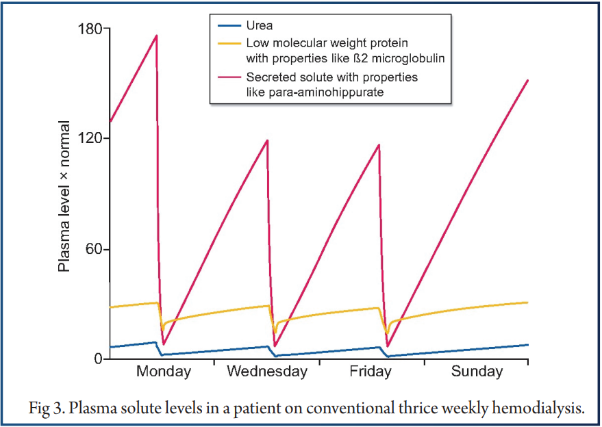 However, patients who feel well and have adequate volume and inorganic ion control would not be obliged to spend more time on hemodialysis to achieve a urea kinetic target. It has the highest dialytic clearance of any known solute but in contrast the native kidney clears many solutes more rapidly than urea, which is in part reabsorbed in the proximal tubule. As a result, levels of other solutes remain much higher relative to normal than urea levels in patients maintained on standard hemodialysis, as depicted in Figure 3.