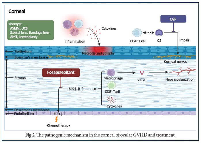 Autologous serum eye drops (ASEDs) containing wound healing factors have shown effectiveness in treating severe cases of ocular GVHD. However, concerns remain regarding infection risk, long-term application side effects, and availability for certain patients. Alternative options include allogeneic serum, umbilical cord serum, and platelet-derived eye drops, but caution is necessary to avoid complications. Scleral lenses, bandage soft contact lenses, amniotic membrane grafts, and surgical procedures like limbal epithelial transplantation and keratoplasty are potential treatments for refractory ocular surface and severe keratitis sicca in ocular GVHD. Inhibition of the SP-NK1R axis with fosaprepitant has shown promise in reducing corneal staining and inflammation in ocular GVHD. Additionally, localized cobra venom factor (CVF) treatment has prevented corneal sensation loss in animal models of ocular GVHD. However, further research is needed to evaluate the therapeutic potential of CVF in human patients.