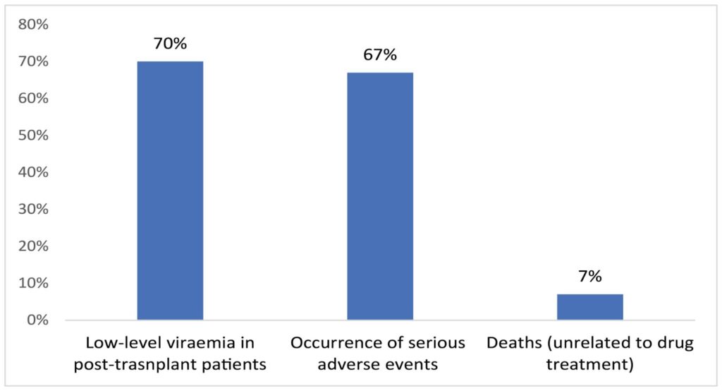 All 30 transplant recipients met the primary endpoint of undetectable HCV RNA at 12 weeks post-transplant, and were HCV RNA-negative at last follow-up. Low-level viraemia was transiently detectable in 21 (70%) of 30 recipients in the early post-transplant period but not aft­er day 14 (Fig 1). 32 serious adverse events occurred in 20 (67%) recipients, with one grade 3 elevations in alanine aminotransferase (ALT) possibly related to treatment. Among the serious adverse events were two recipient deaths due to causes unrelated to study drug treatment with neither patient ever being viraemic for HCV (Fig 1).
