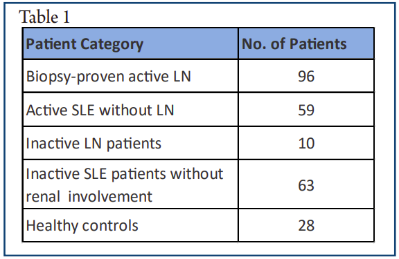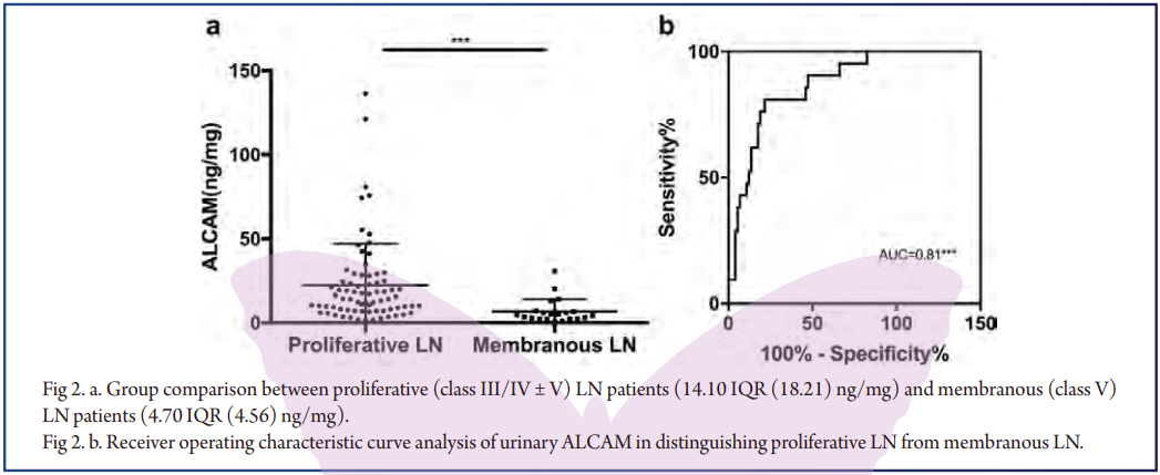 In this cross-sectional study, a total of 256 patients and controls were recruited. A total of 96 biopsy-proven active LN, 59 active SLE without LN, 10 inactive LN patients, 63 inactive SLE patients without renal involvement, and 28 age- and gender-matched healthy controls were recruited(Table 1). Urinary levels of ALCAM were determined by ELISA. Renal histopathology was reviewed by an experienced renal pathologist.